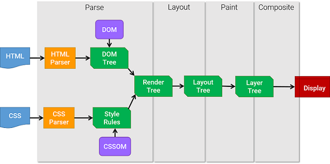 이렇게 만들어진 DOM TREE와 CSSOM TREE를 합쳐서 RENDER TREE를 만들게 됩니다. 이 렌더트리에 있는 각 노드들의 실제 화면상의 위치를 잡아주고(Layout) 그 노드들의 스타일을 입혀주며(Paint), 페인트 과정에서 나눠진 많은 레이어를 하나로 합치면서 브라우저의 렌더링 과정이 종료되게 됩니다.(Composite)