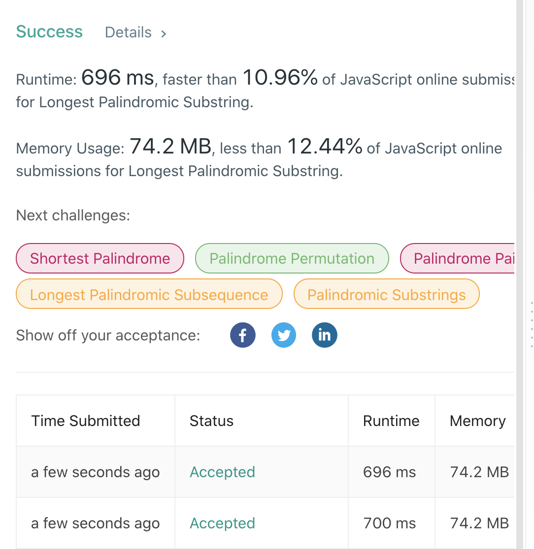 그럼 길이가 2일때 구해놨던 정보들이 길이가 3일때 해당 부분이 팰린드롬인지 판단할때 중복계산을 막아 줄 수 있기 때문에 어느정도 계산량을 줄일 수 있었다. 다만 이렇게 해도 퍼센티지가 너무 낮은걸 보니 별로 좋지 못한 풀이인것같다.