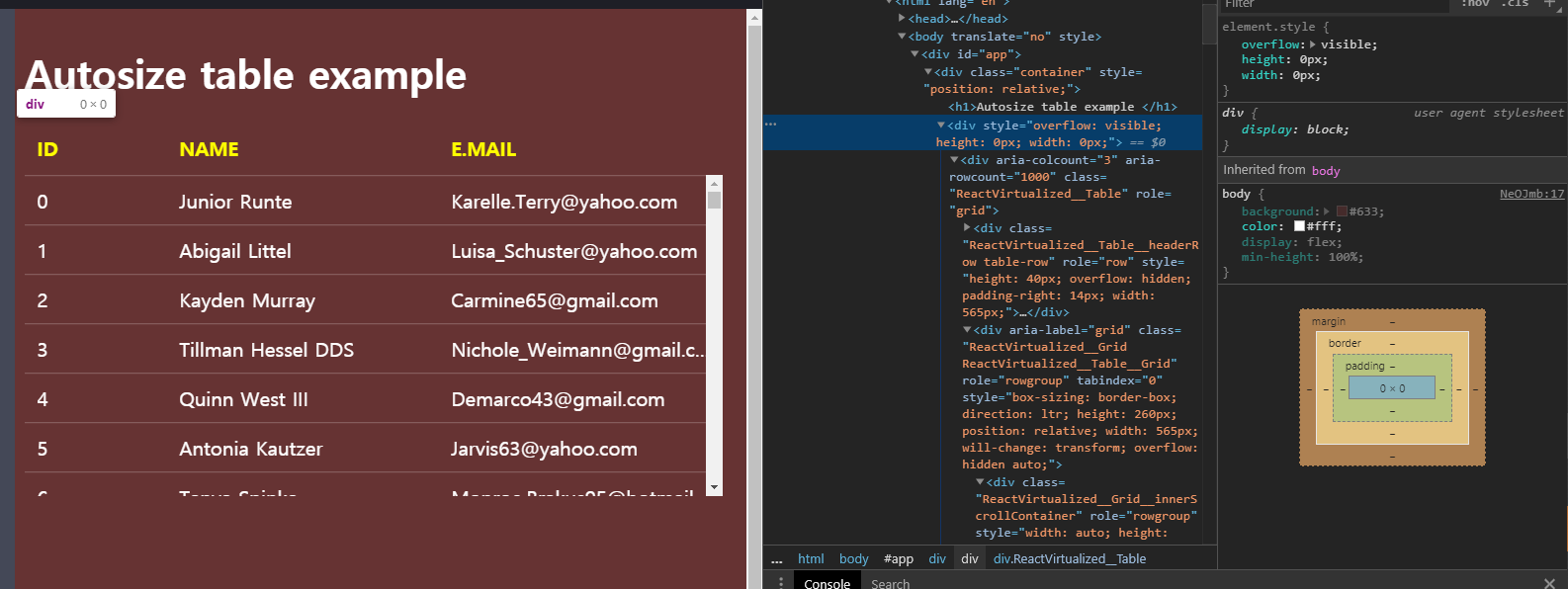 따라서, AutoSizer의 width와 height를 0으로 설정해서 자식에 따라 부모가 같이 커지는 일을 방지 할 수 있다.