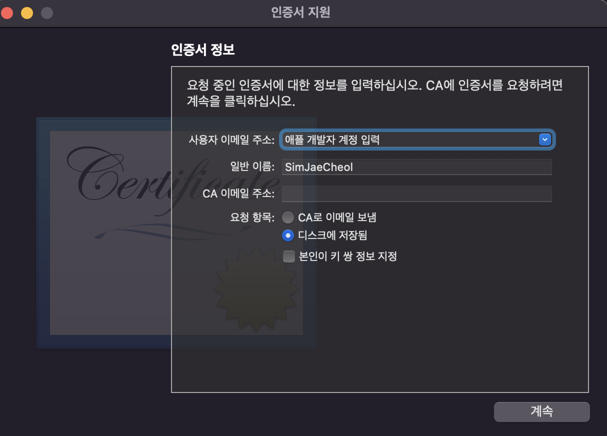 - 키체인 접근 > 상단 메뉴 > 인증서 지원 > 인증기관에서 인증서 요청 클릭